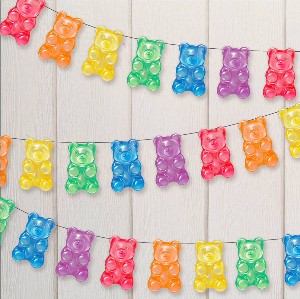Add sweetness and charm to your next party with this adorable set of gummy bear party supplies. Featuring 3 individual garlands, each strand showcases colorful bears in red, orange, yellow, green, blue, and purple. Whether you're planning a gummy candy birthday party or decorating for a cute bear baby shower, a candyland themed celebration this set brings vibrant personality to any celebration.