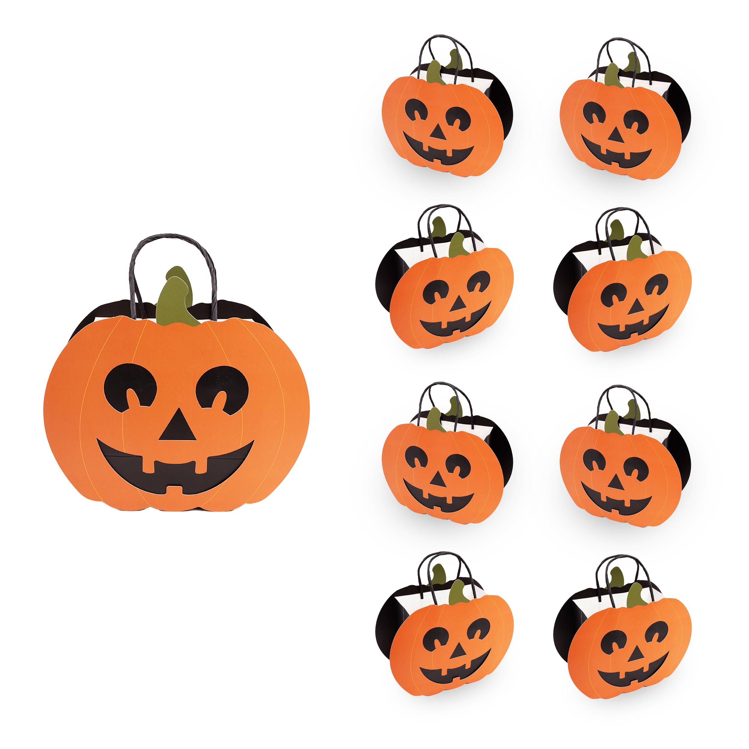 - 8 small pumpkin shaped candy bags featuring orange pumkin with cute spooky face pumpkin shape on black bag, perfect for trick or treat bags, classroom events, and themed birthday favors. Use as Halloween party favor bags, spooky gift bags, or return gift bags.