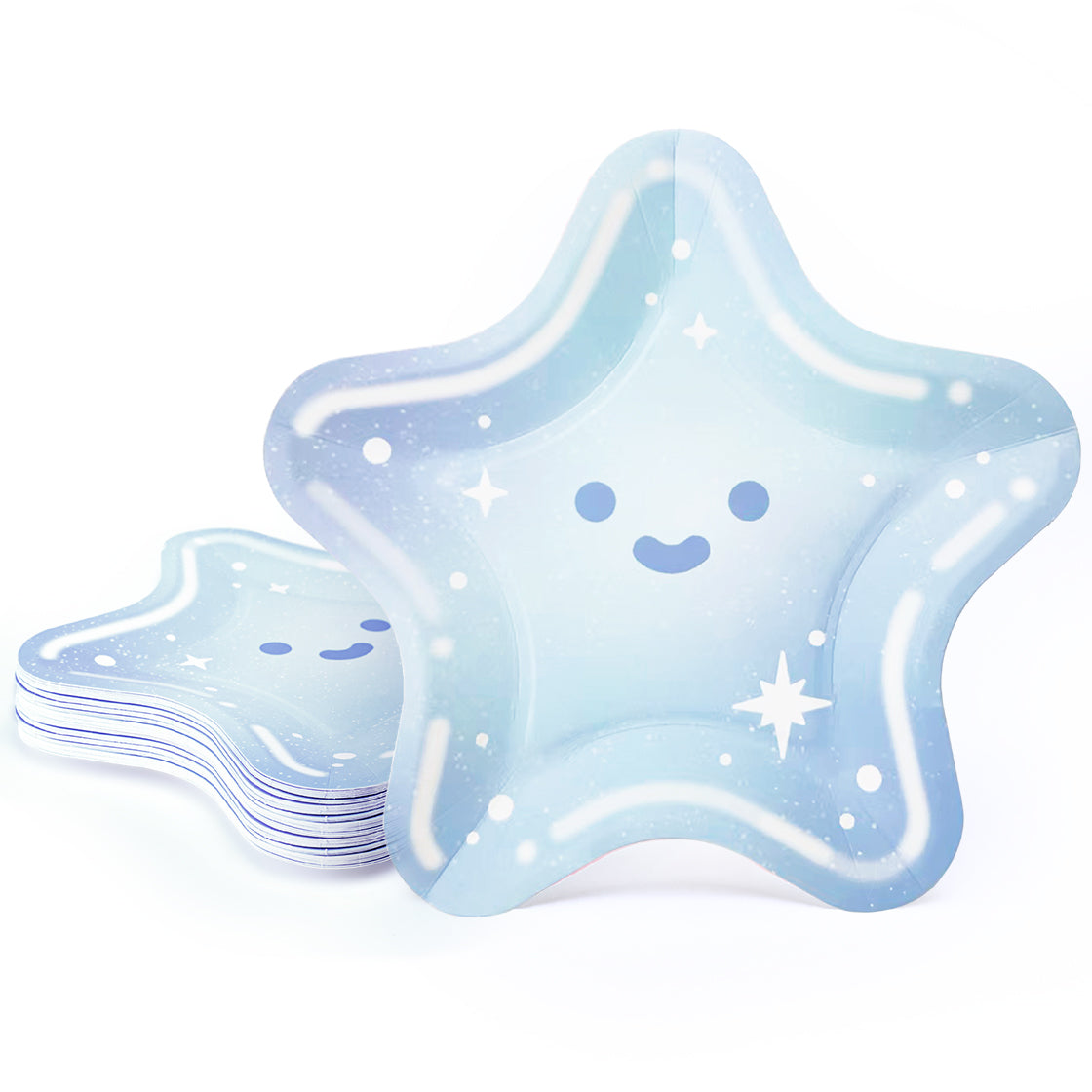Pack of 24 blue star-shaped 9″ disposable plates ideal for boys’ birthdays, baby showers & gender reveals with fun space & superhero themes.