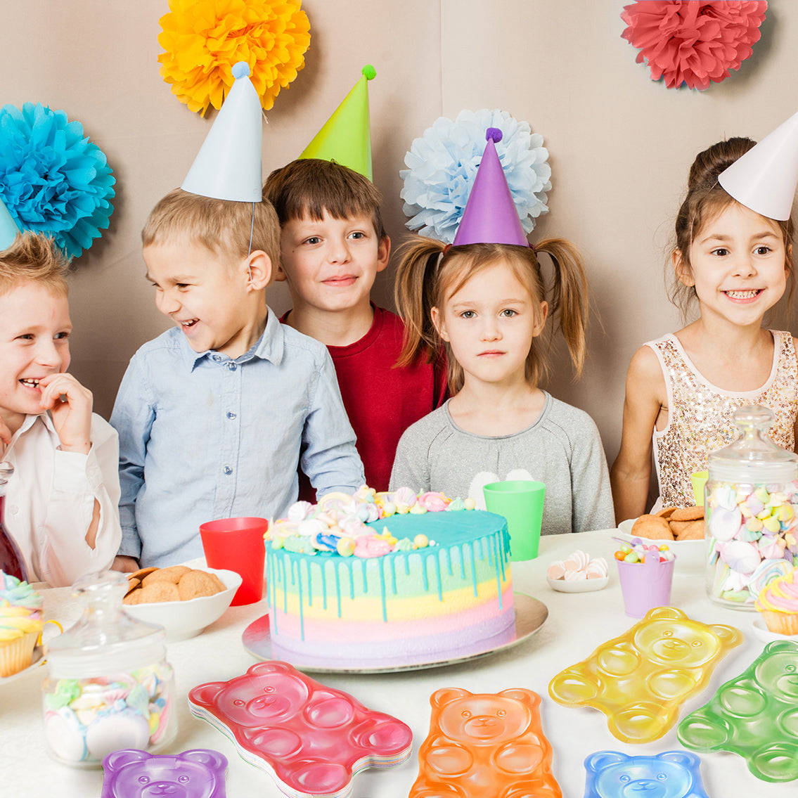 Unlike ordinary tableware, these cute bear shaped plates and pastel gummy bear plates showcase a playful design that fits seamlessly into candyland party plates or bear candy party supplies. Their fun shape and multicolor design make them a standout choice.