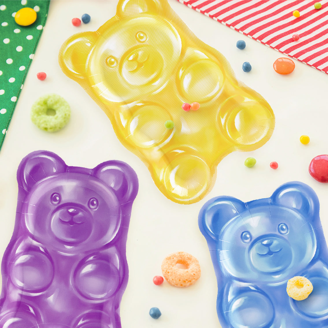 Single-use, disposable kids candy party tableware for easy cleanup. Simply place these gummy bear dessert plates at your table settings or stack them at a sweet shop paper plates station for grab-and-go use