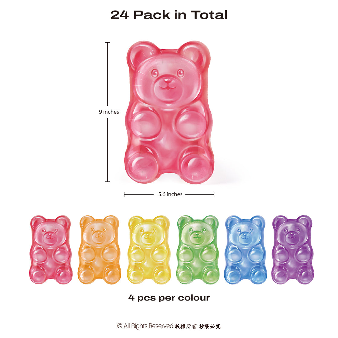 This set contains 24 gummy bear paper plates, each measuring 7 inches. These colorful bear party plates feature vibrant bears in red, orange, yellow, green, blue, and purple, perfect for desserts, snacks, and cake.
