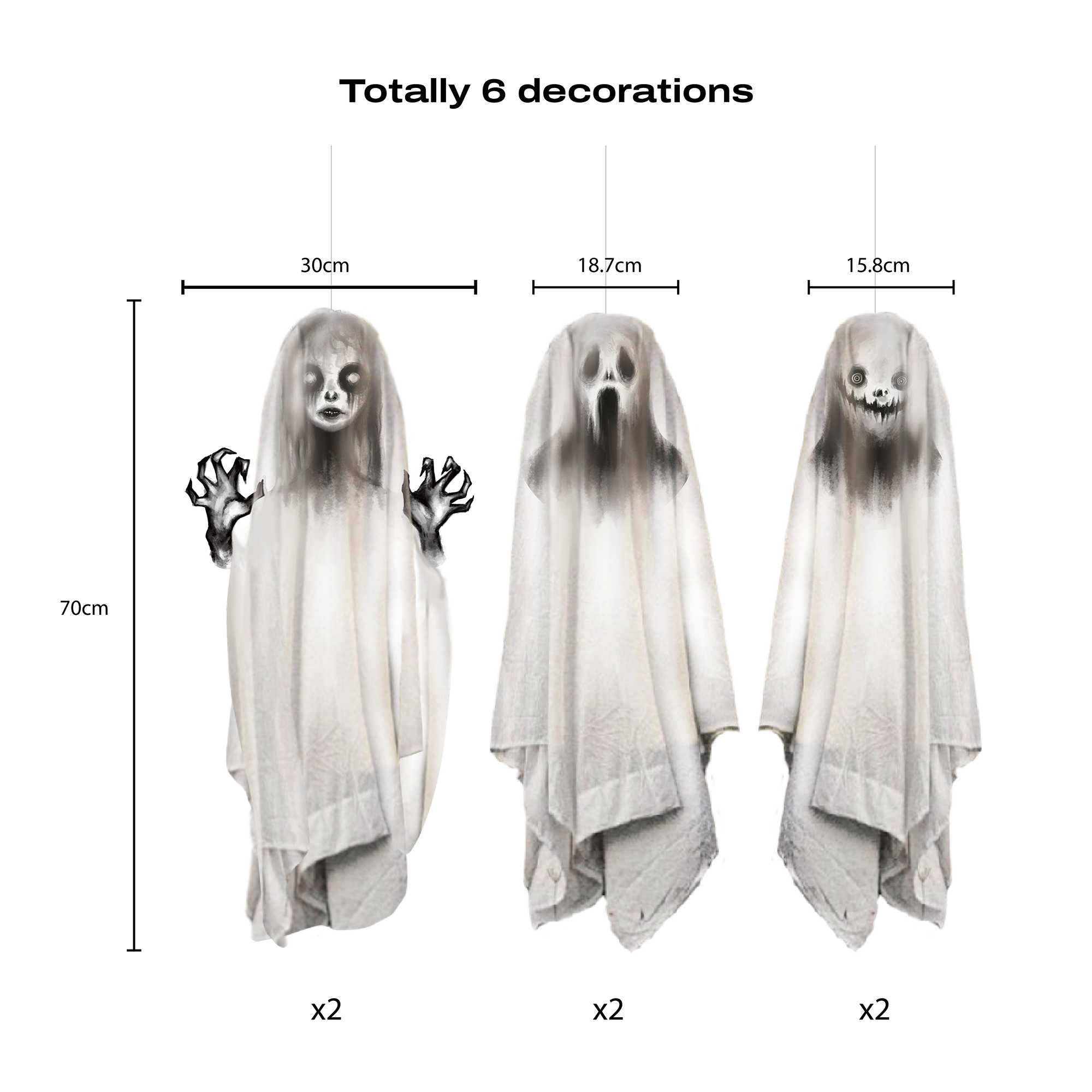 This set contains 6 pieces of ghost garland party supplies, featuring translucent fabric and spooky ghost faces. With 3 unique designs (2 of each), these ghoulish decorations create a chilling, floating illusion for your spooky haunted house decor. Each Ghost is 27.5 inches long and ranges from 11.8 inches to 6.22 inches wide.