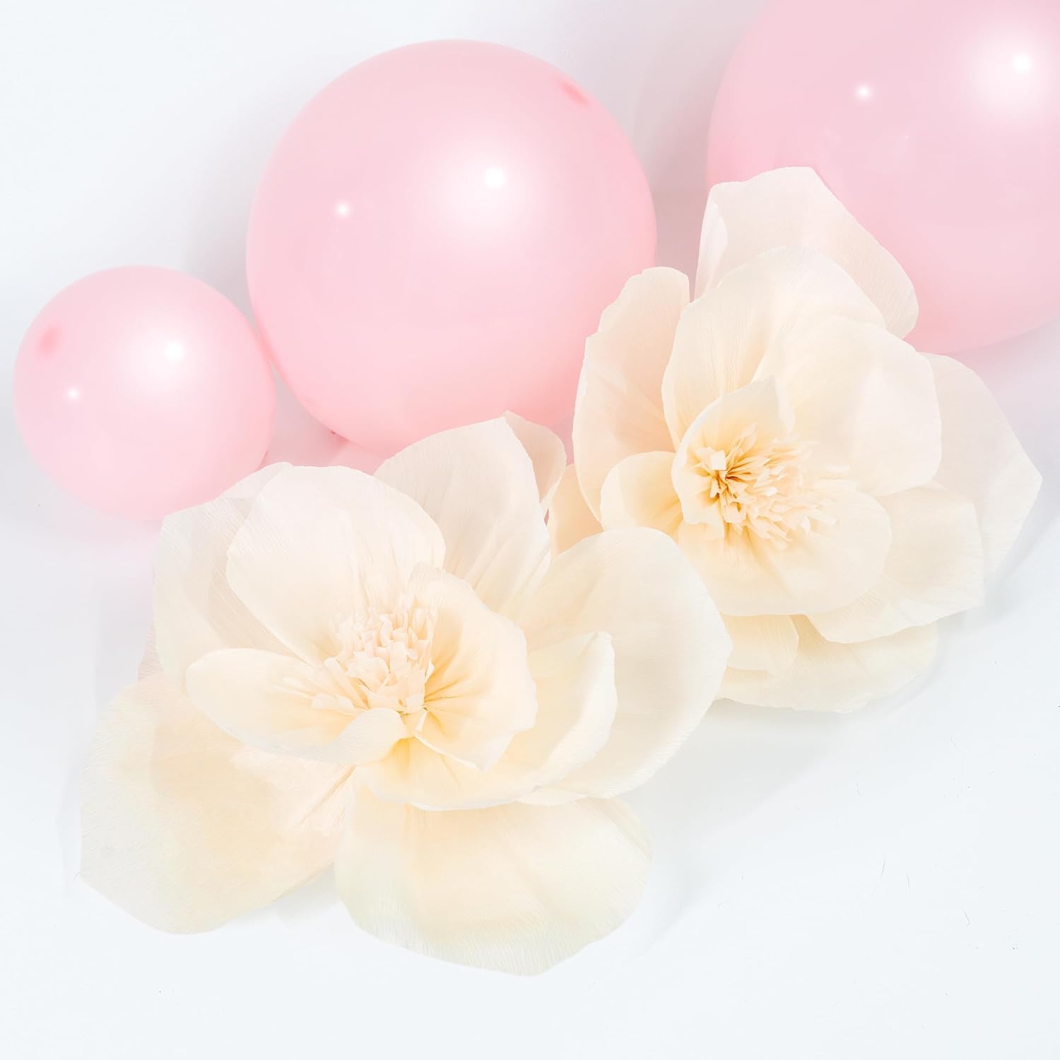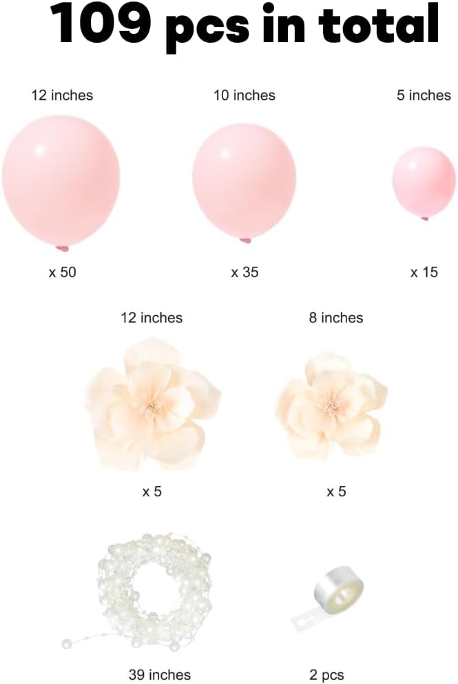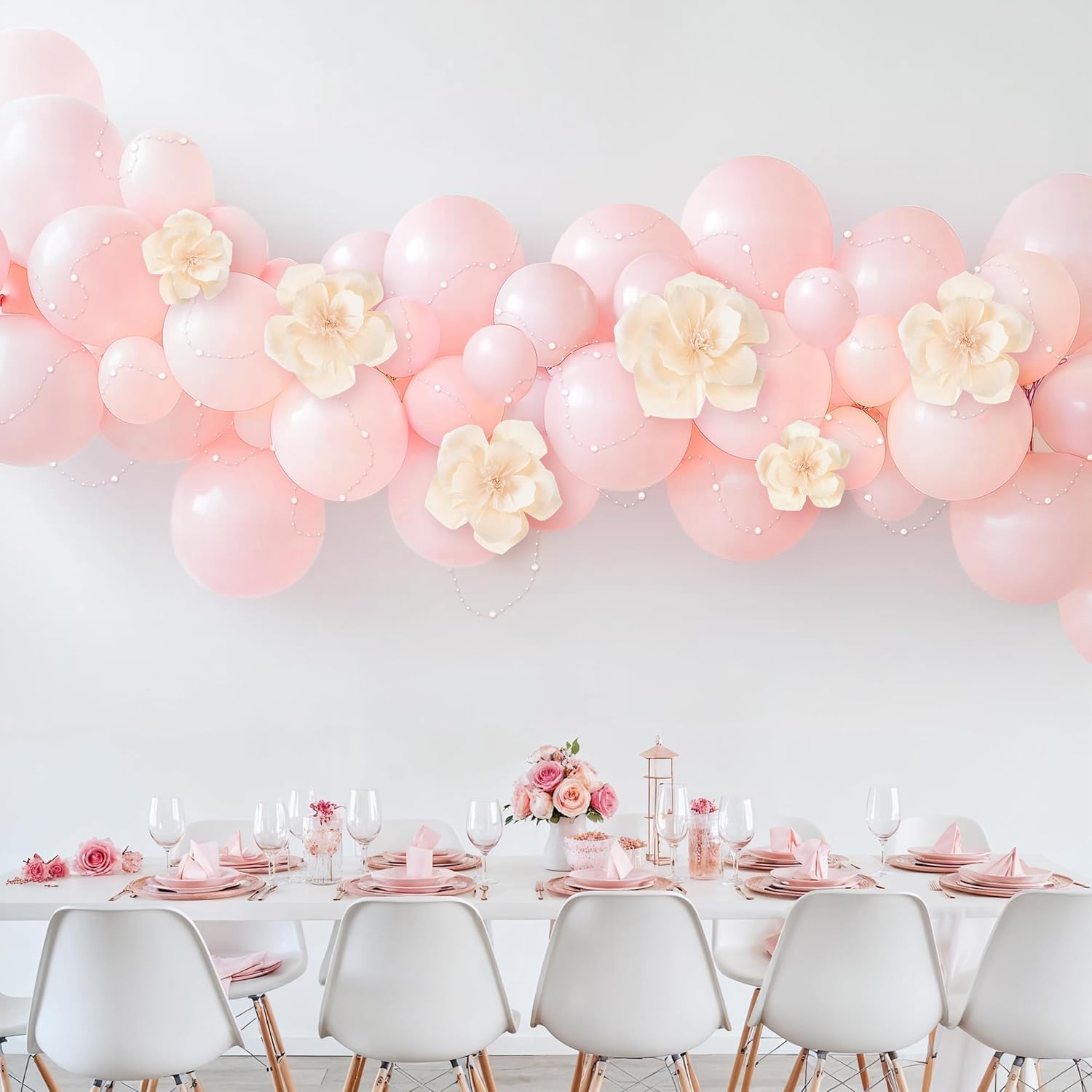 Pastel Pink Balloon Garland Arch Kit with Pearls and Paper Flowers (109 Pcs)
