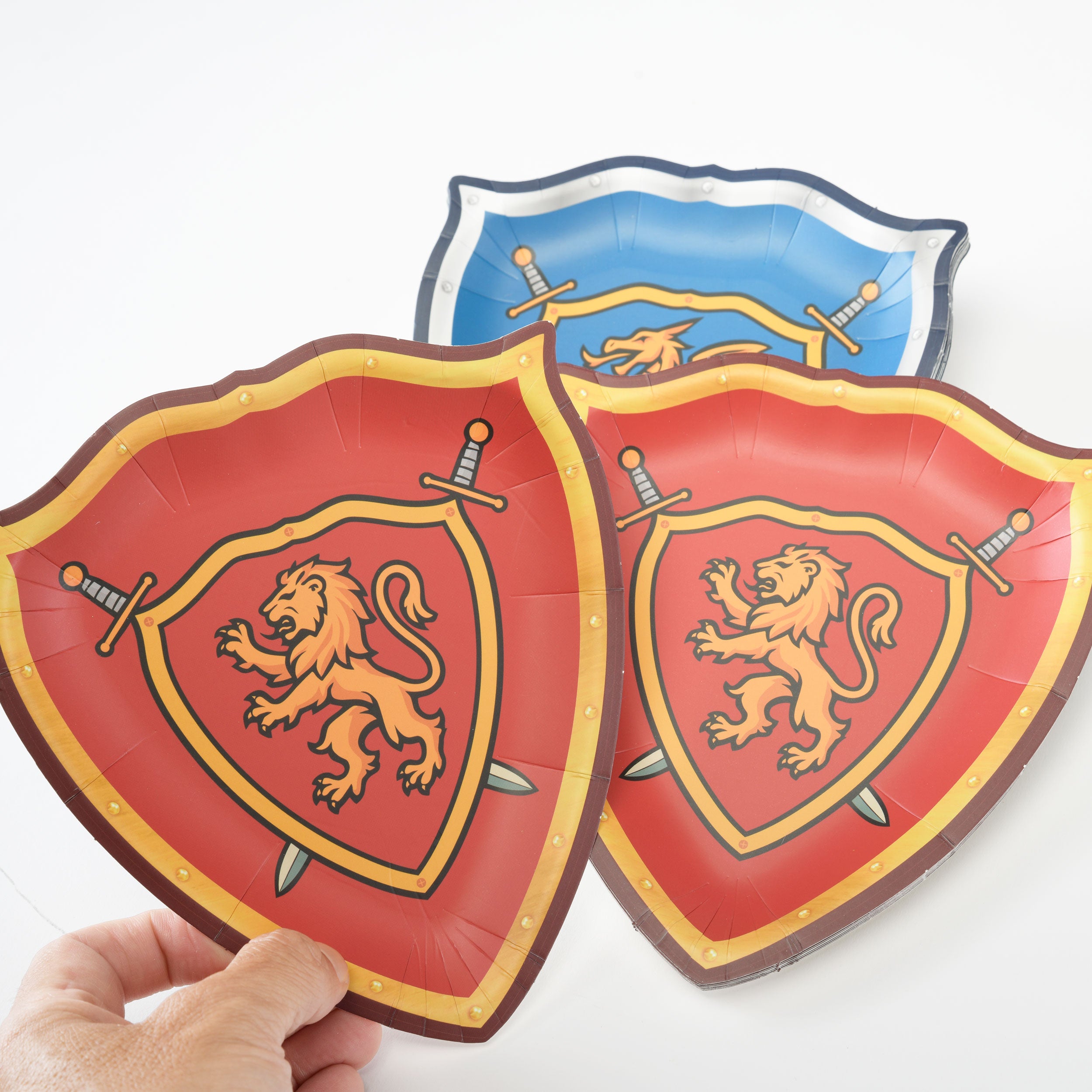 This set includes 24 shield shape paper plates with two distinctive medieval designs. Twelve plates feature a red lion emblem and twelve display a blue dragon motif—perfect for bringing legendary battles and kingdoms to your table setting. These sturdy plates are great for snacks, cake, or party meals.