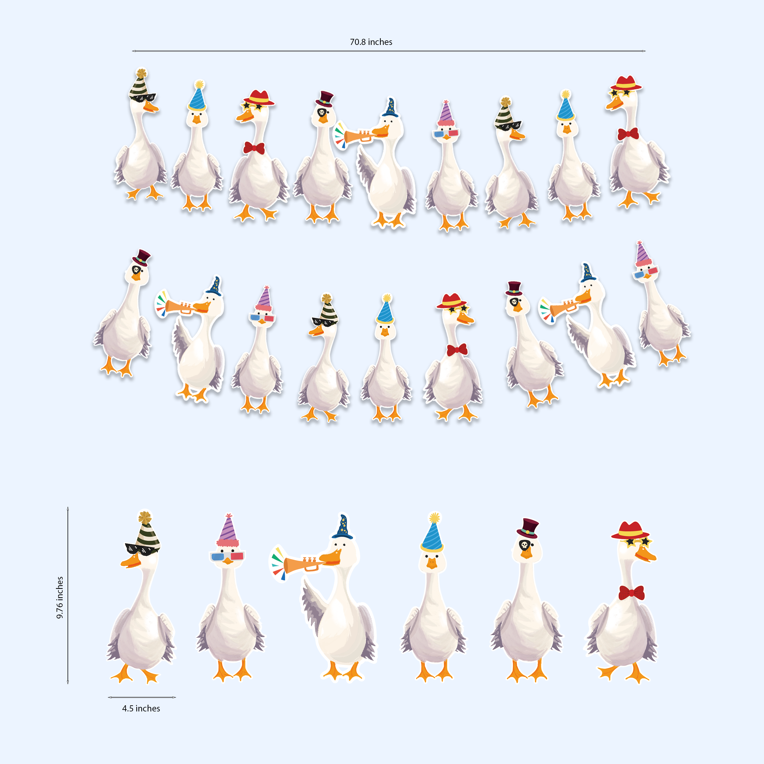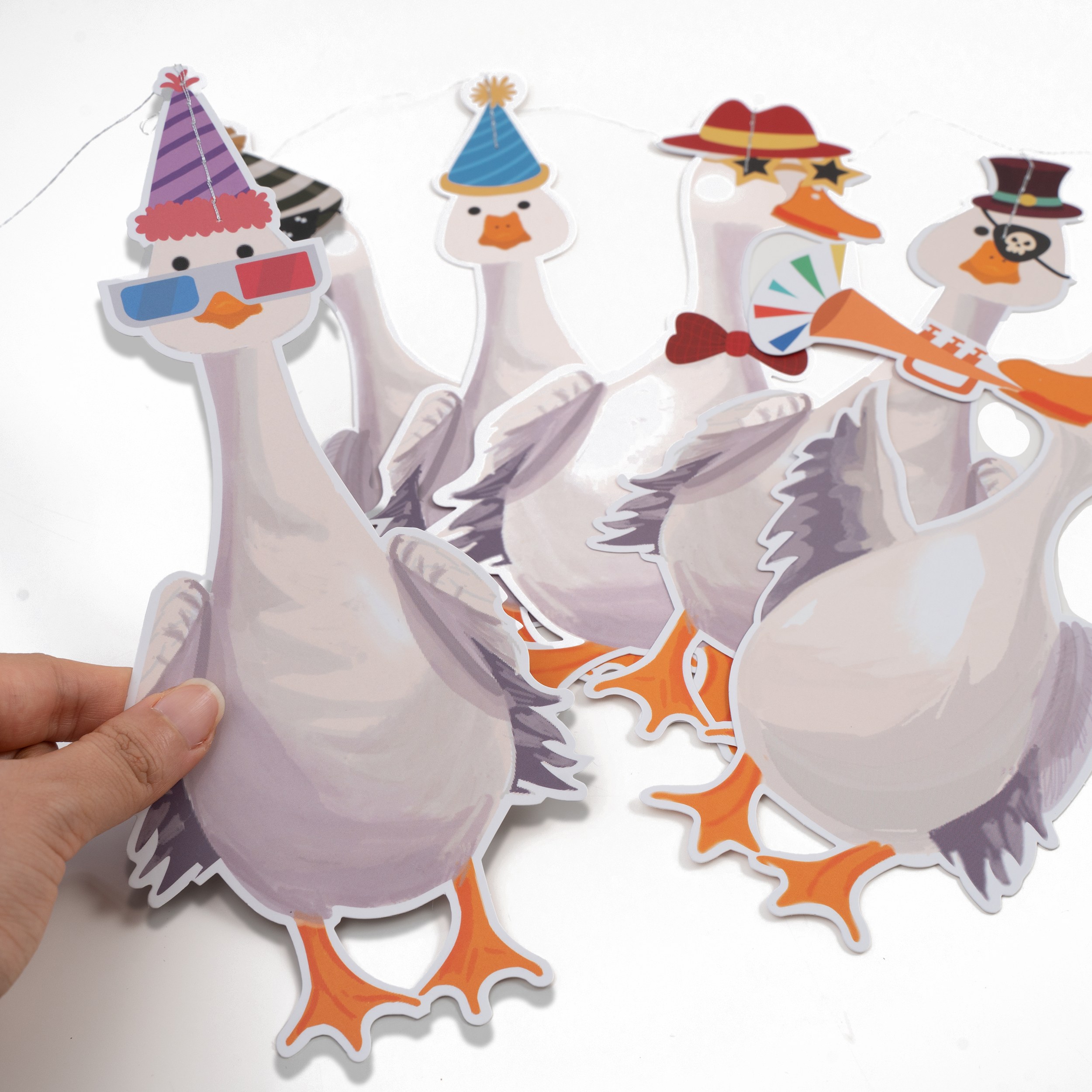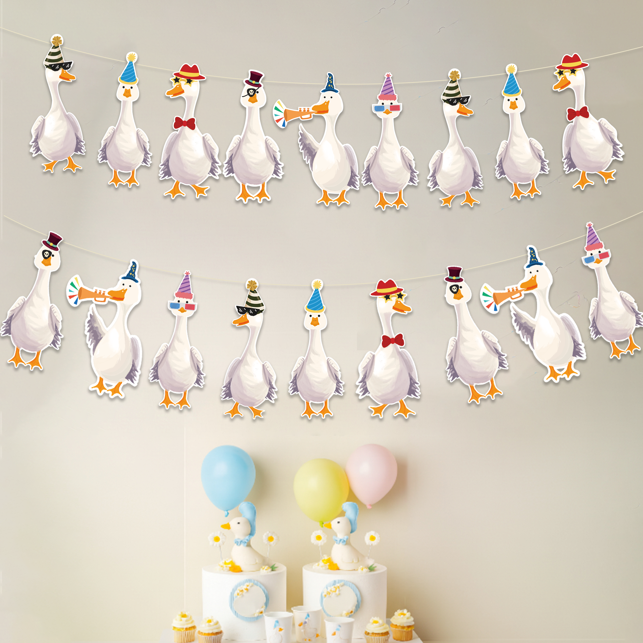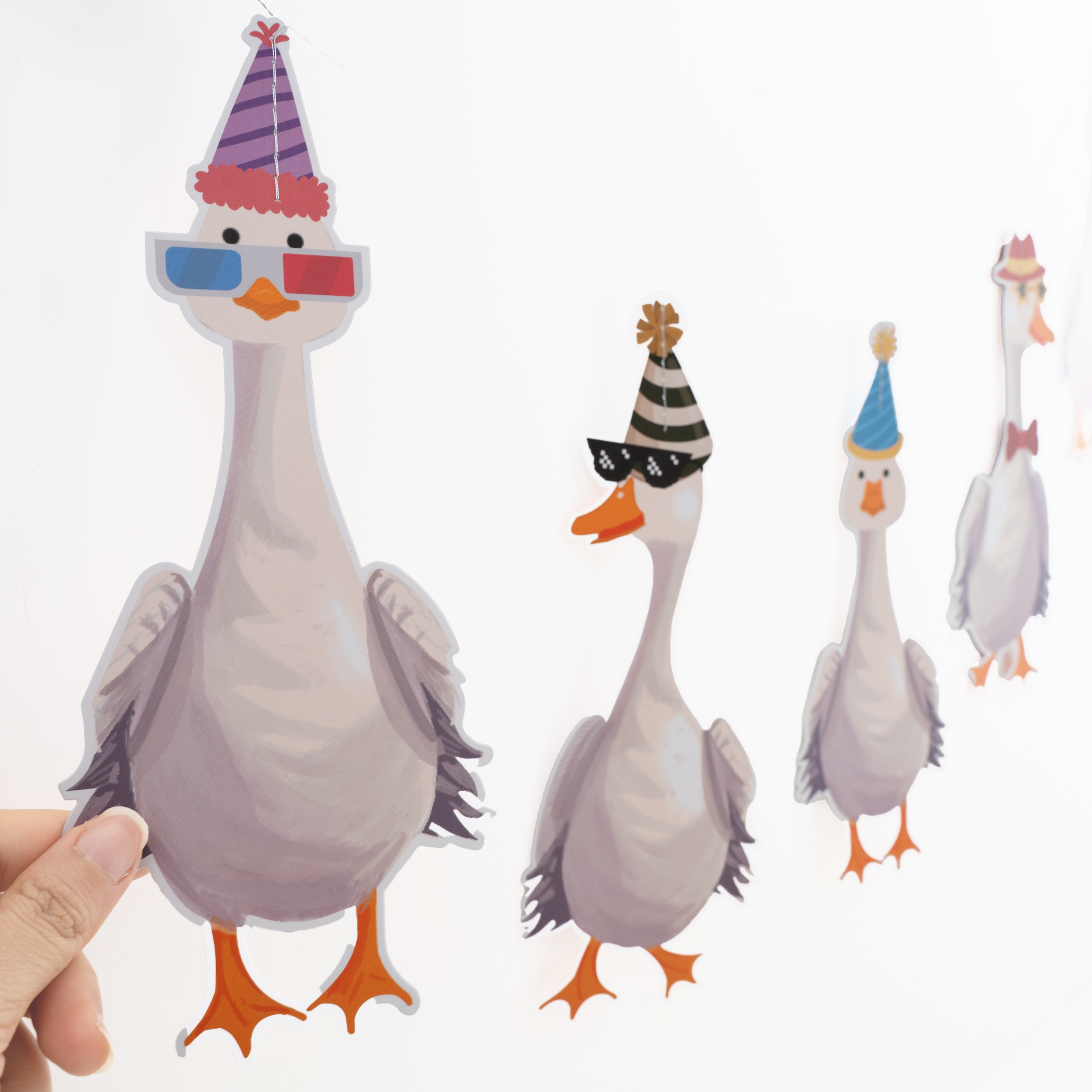 This set includes 2 pieces of silly goose garland, each measuring 2.28 meters wide. Featuring geese in party hats, sunglasses, and ties, these festive silly goose decorations are printed on sturdy cardstock and come pre-strung for convenience. A playful touch for themed celebrations. Each goose measures 11.5 cm x 24.8 cm large.