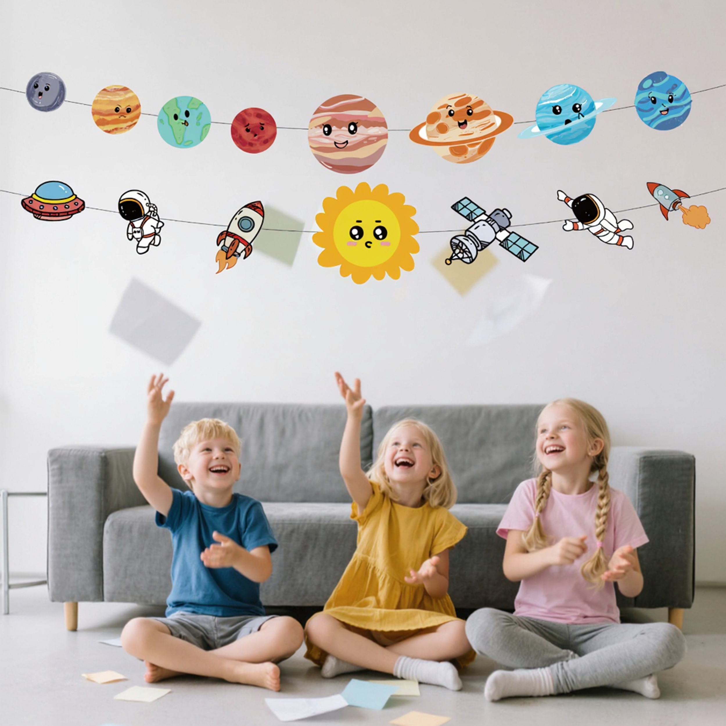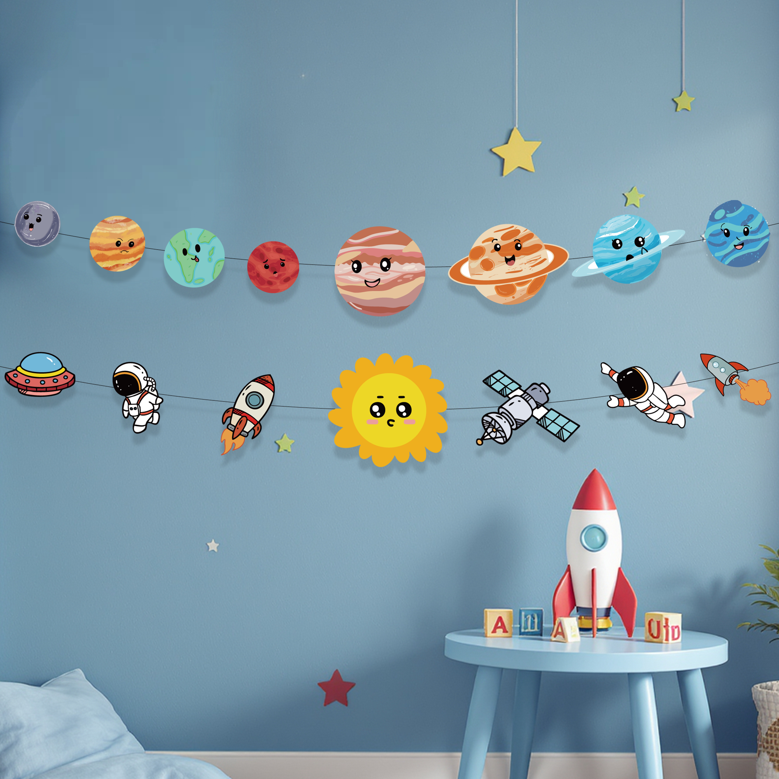 Unlike ordinary decorations, this space themed garland includes a complete lineup of celestial bodies and rockets, crafted with vibrant details. Its layered layout and mix of paper cutouts make it a standout piece among galaxy party decorations and space hanging decorations.