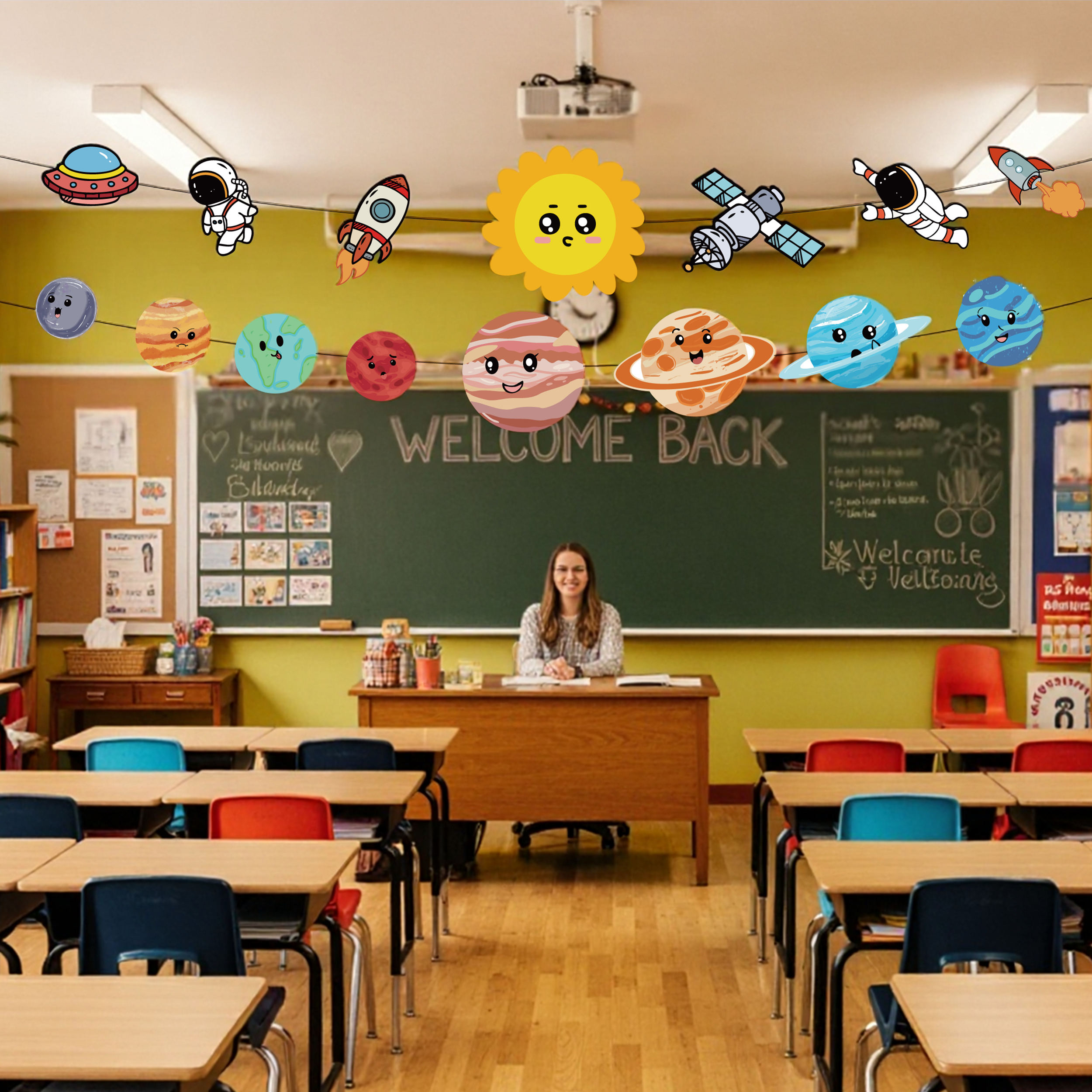 This space-themed garland is ideal for decorating science fairs, outer space party supplies, or a fun kids' solar system party. Each strand brings a pop of color and charm, making it equally suitable for a rocket ship party banner, galaxy party decorations, or space science party decorations.