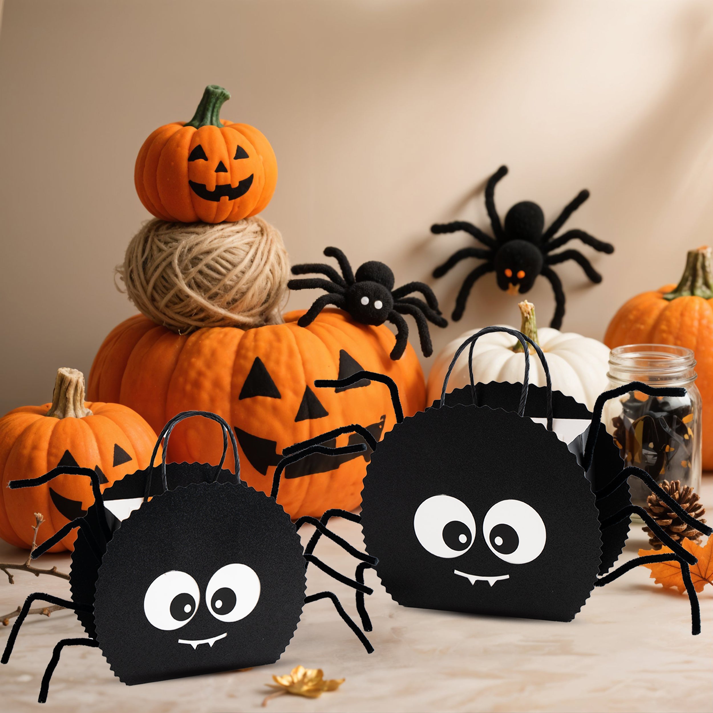 These spider gift bags feature black glitter cardstock, googly eyes, and fuzzy pipe cleaner legs for a spooky-cute look. Great for Halloween party decorations, summerween birthdays, spider party favors, and witch-themed baby showers. A fun twist on classic Halloween goodie bags and kids Halloween bags.