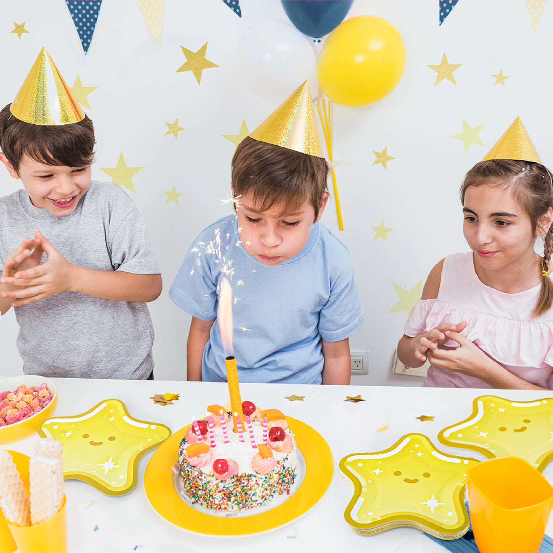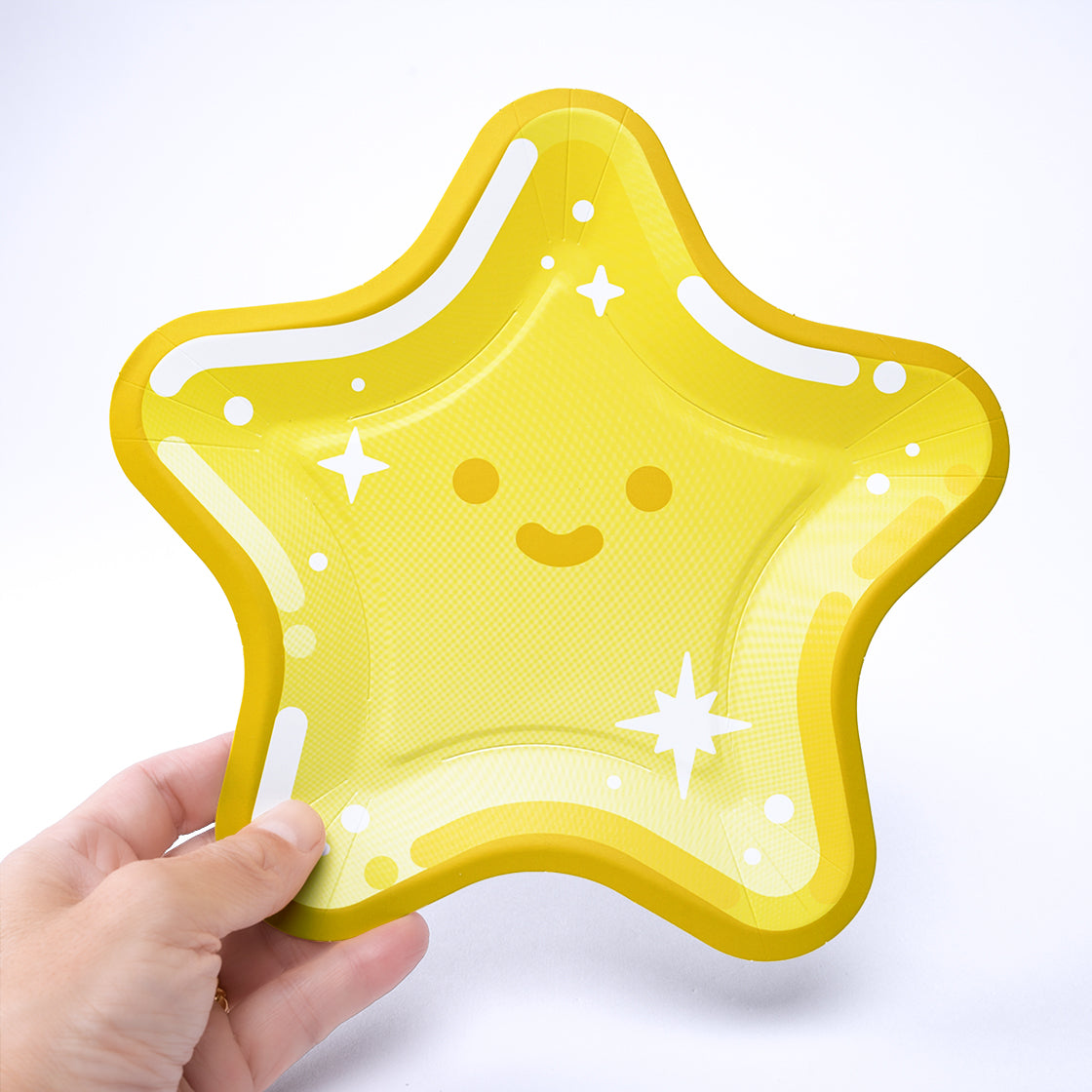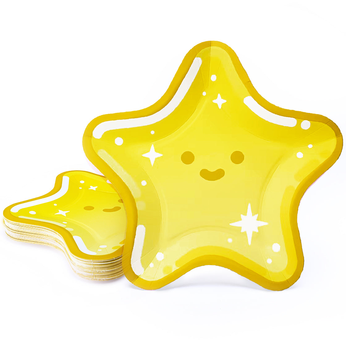 Measuring 9-inch by 9.5-inch, these smiling star party plates are just the right size for cake, snacks, and finger foods. Whether you're planning a star-themed birthday, a sweet nursery gathering, or a classroom celebration, these kawaii star plate decor pieces add a whimsical touch your guests will love.