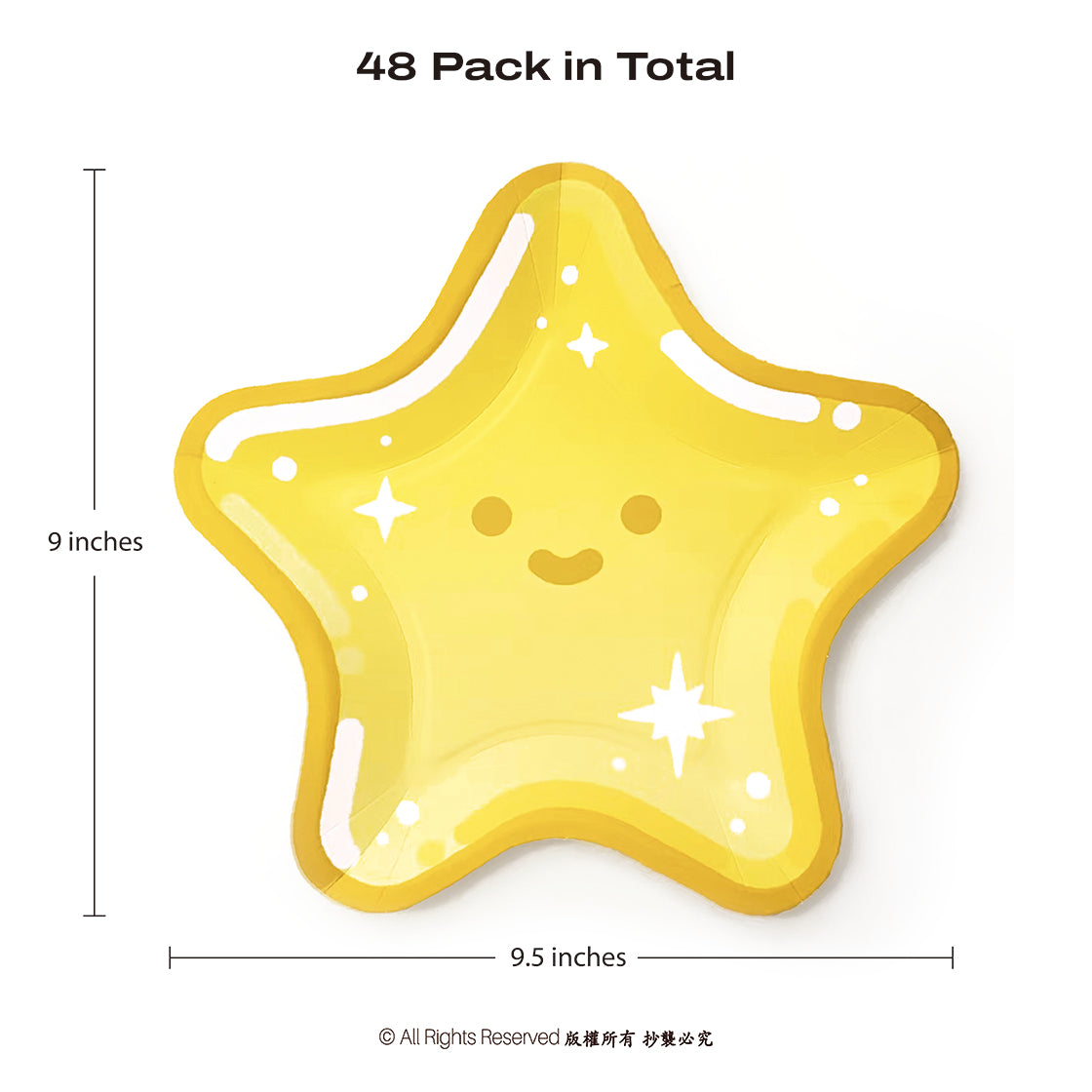 This set includes 48 cute star paper plates featuring an adorable smile and shimmering sparkle accents. Each plate measures 9 by 9.5inch and is shaped like a star, ideal for party snacks, desserts, or small meals. A delightful addition to any star birthday party supplies collection.