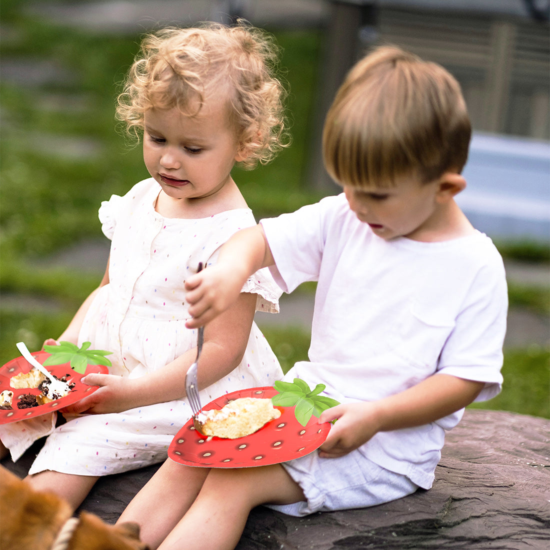 This pack includes 24 strawberry shaped paper plates, each 7 inches in size. Perfect for cake, snacks, or finger foods, these strawberry party paper plates are great for small hands and big smiles.