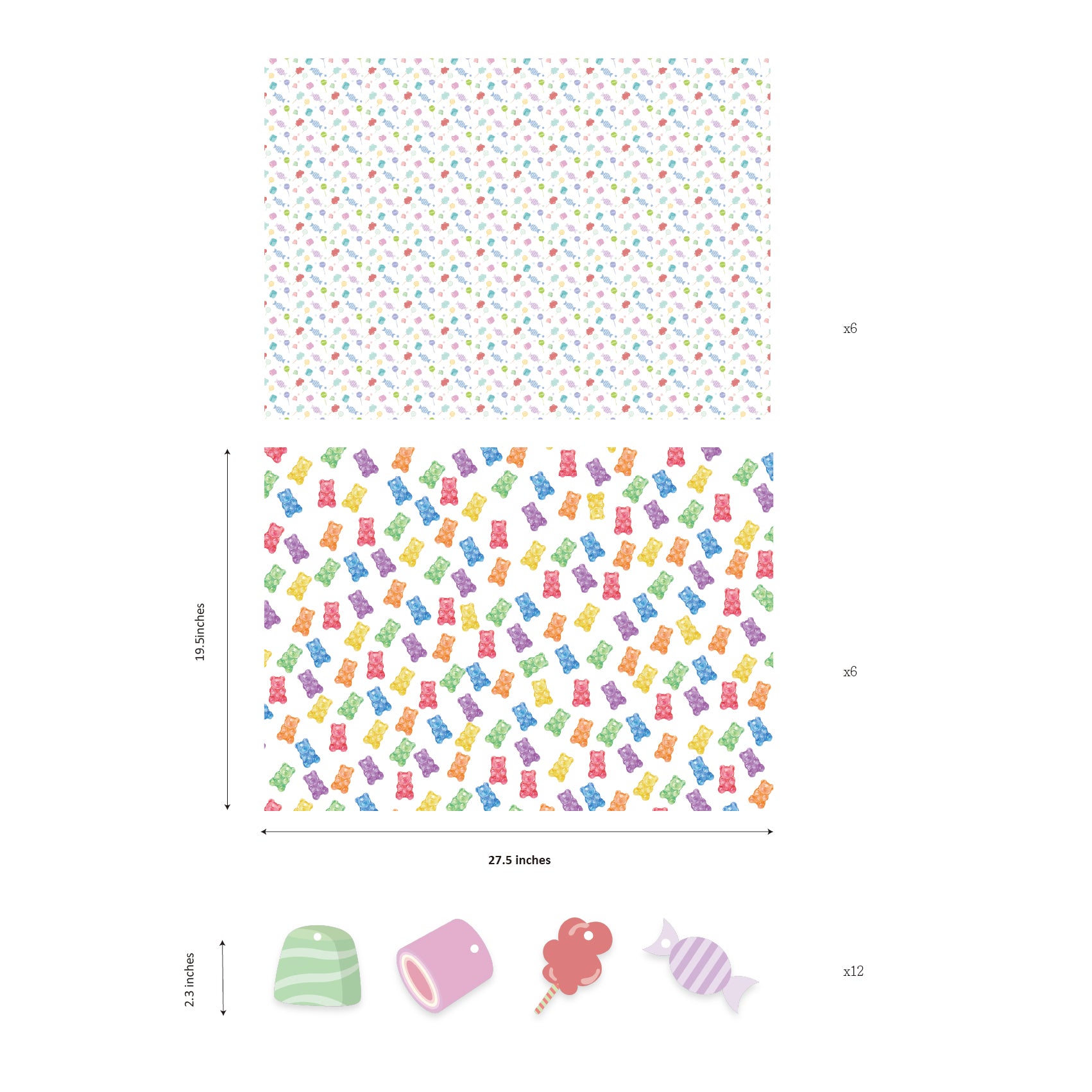 This set includes 12 large sheets of candy gift wrap paper – one featuring a colorful collage of classic hard candies, and the other adorned with cheerful gummy bear decorations. Each sheet is generously sized and printed on durable paper, making it ideal for various party needs.