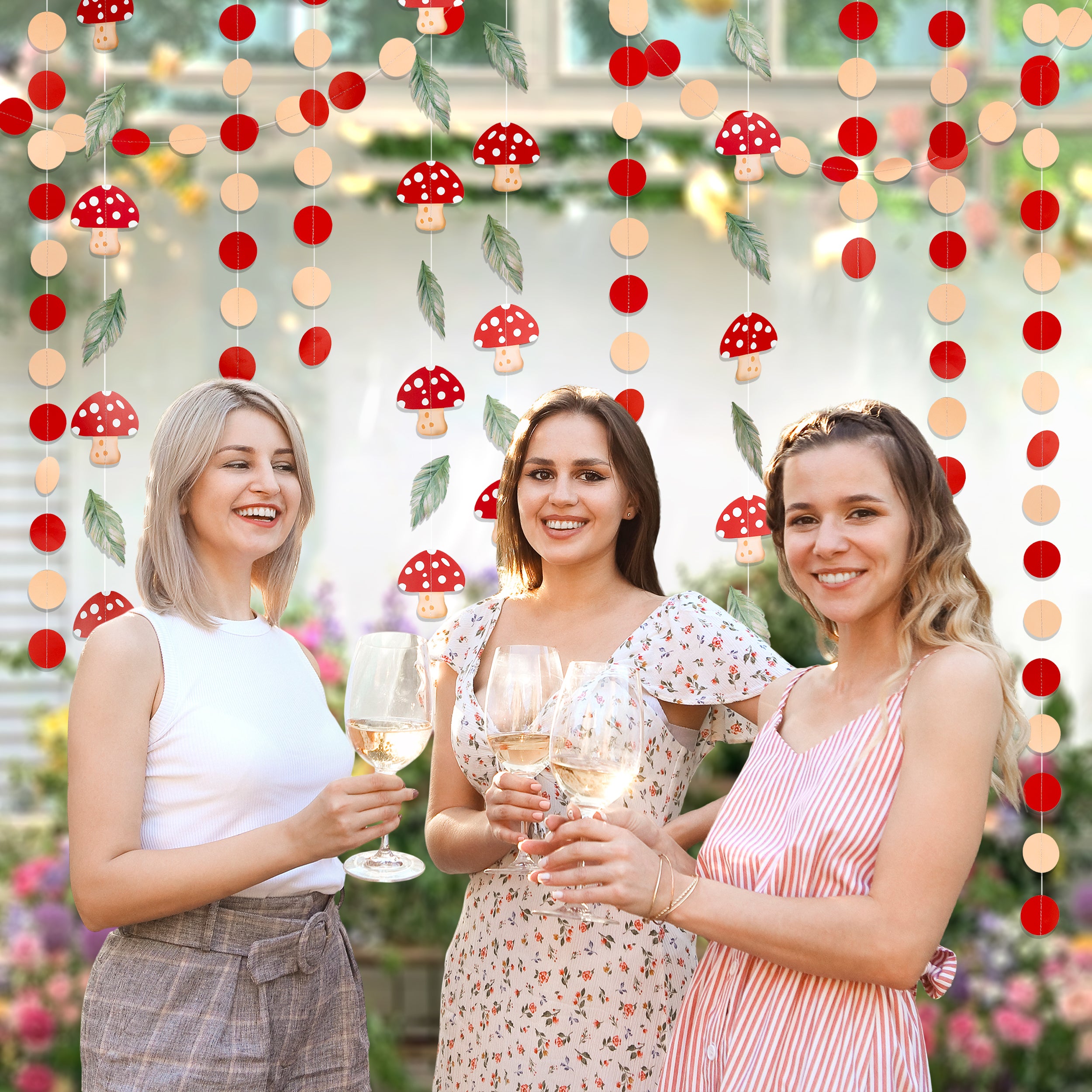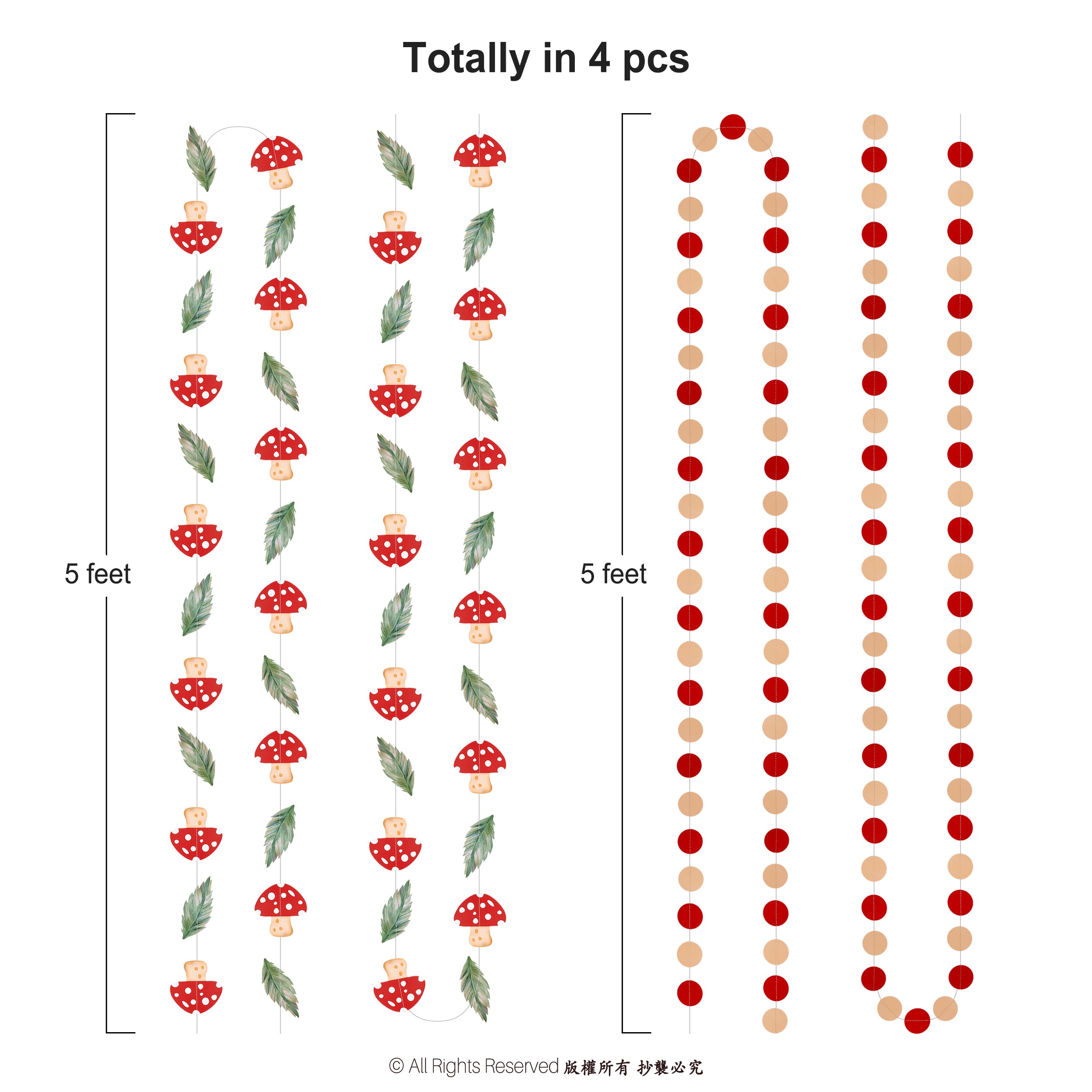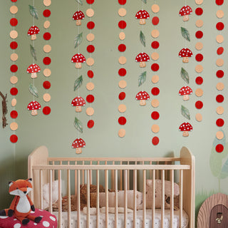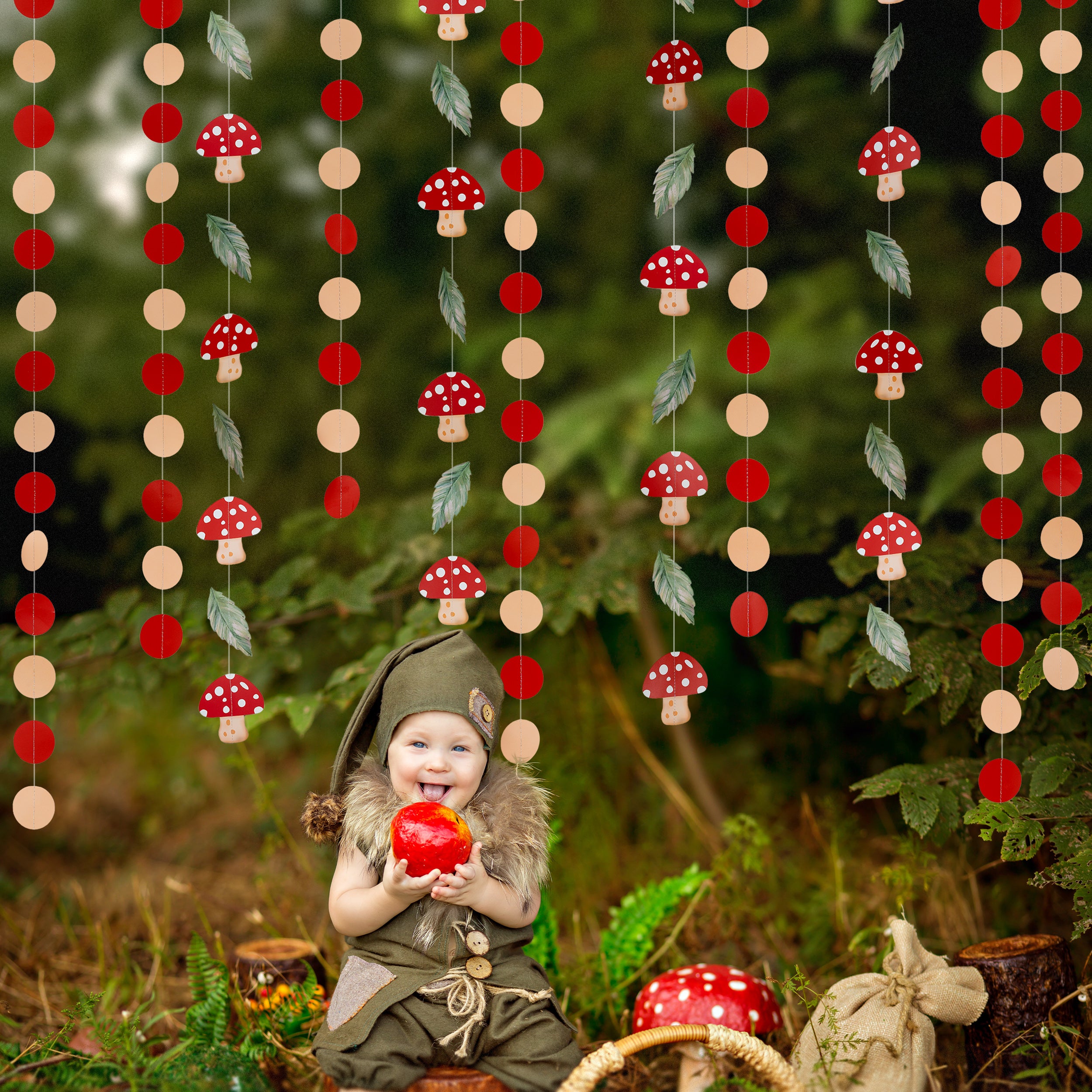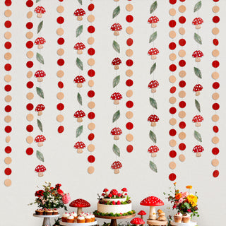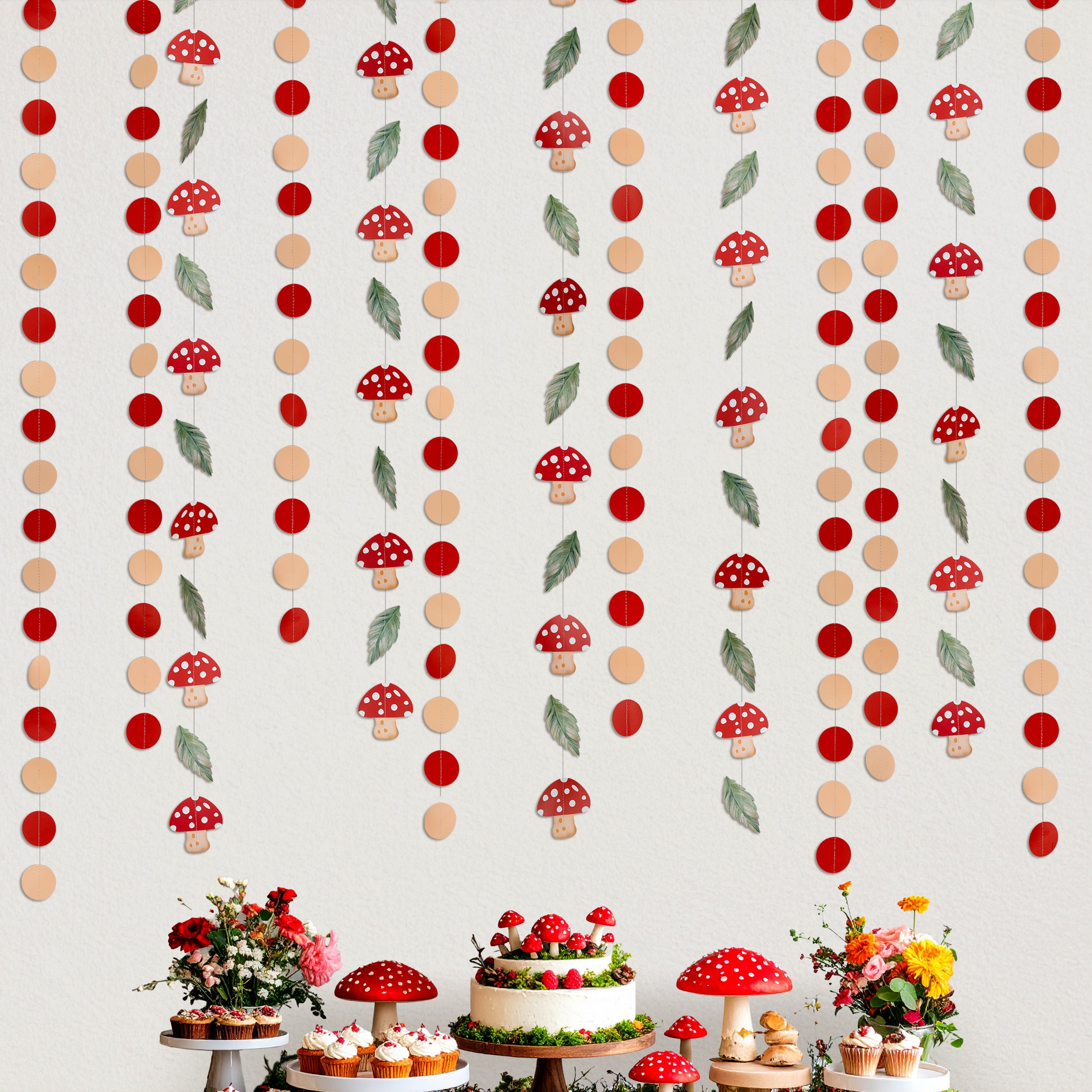 This enchanting Mushroom Leaf Circle Dot Garland set comes complete with four beautifully designed garlands to transform any space into a magical woodland wonderland. The package includes two strings of charming mushroom and leaf, featuring vibrant red and beige toadstools paired with lush green foliage for an authentic enchanted forest look. Additionally, you'll receive two decorative circle dot garlands in coordinating red and beige tones, perfect for adding playful accents to your party decor. Together, these four high-quality garlands create a cohesive, whimsical atmosphere ideal for mushroom-themed birthdays, fairy tale weddings, woodland baby showers, garden parties, fairy parties or enchanted forest celebrations. Simply hang them across walls, tables, or photo backdrops for instant fairycore, cottagecore, or storybook-inspired decor that delights guests of all ages.